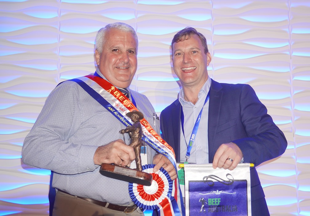 Terry Nolan receives his trophies and sashes for champion and reserve champion carcase from ANZ’s Greg Black.