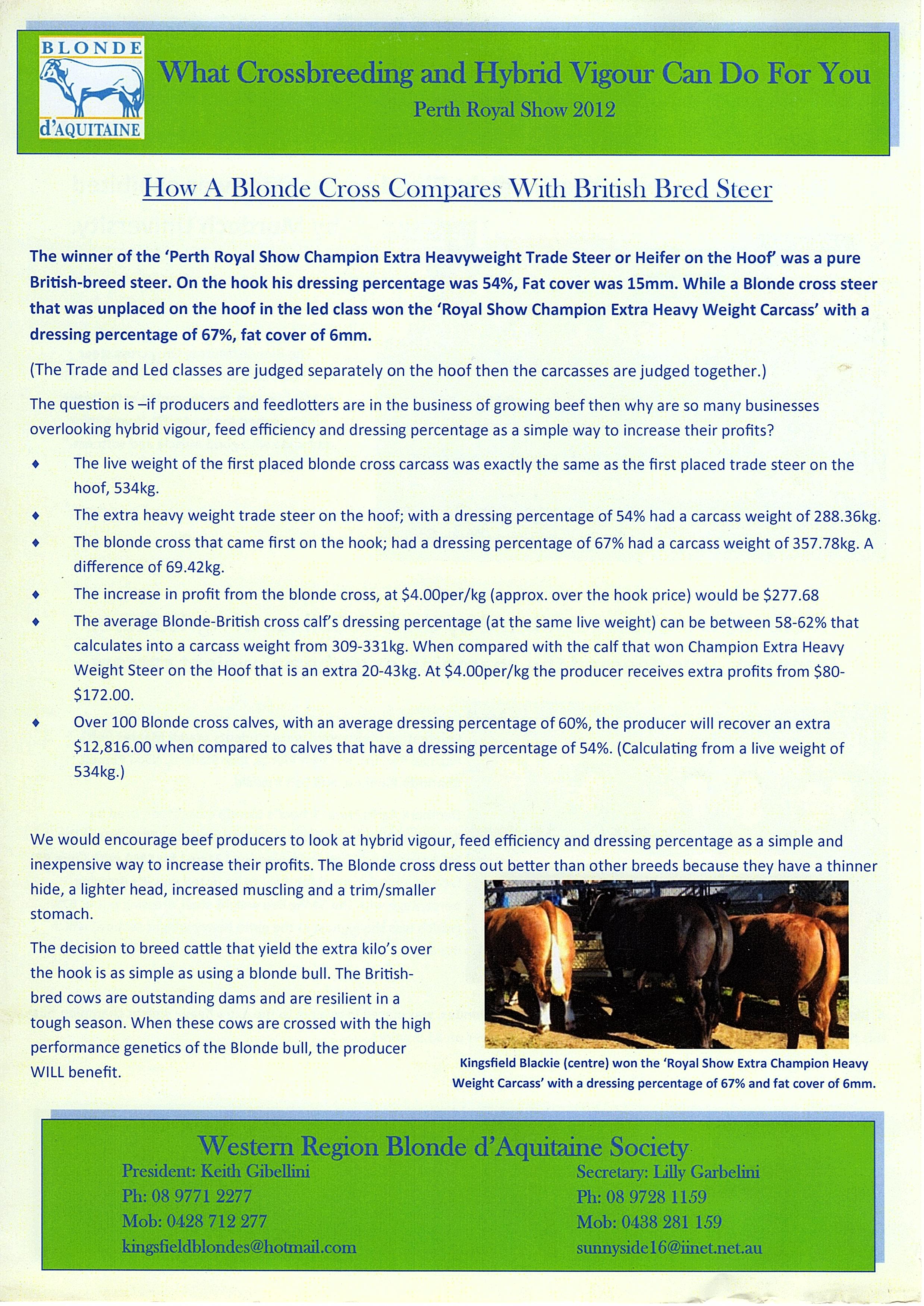 Please remember that these figures are based on the 5% difference in dressing percentage between a British bred show calf and a halfbred Blonde commercial calf. Our commercial blonde/murray grey calves have dressed out up to 62% and 3/4 to pure blonde calf will dress out even higher.